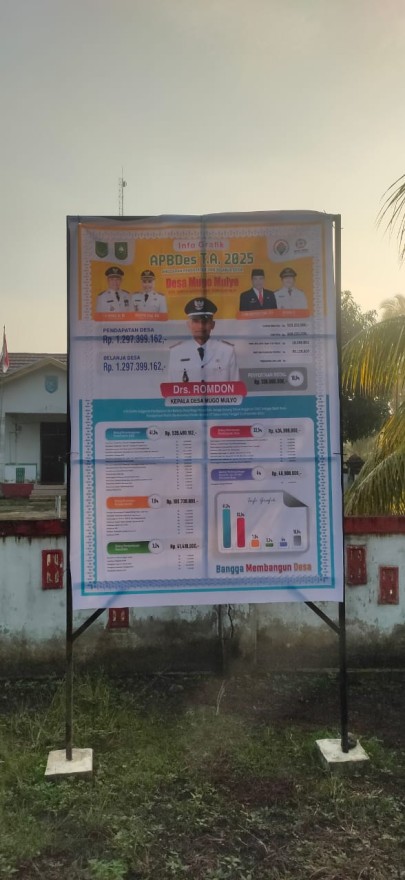 PPID - MUGO MULYO. Pemerintah Desa Mugo Mulyo Tingkatkan Transparansi Pengelolaan Anggaran melalui Publikasi APBDes Pemerintah Desa Mugo Mulyo, Kecamatan Sungai Batang, Kabupaten Indragiri Hilir berkomitmen untuk meningkatkan transparansi dan akuntabilitas dalam pengelolaan Anggaran Pendapatan dan Belanja Desa (APBDes). Komitmen ini diwujudkan melalui pemasangan banner transparansi dan infografis APBDes tahun anggaran 2025. Langkah ini diambil untuk memberikan informasi yang jelas dan mudah dipahami oleh masyarakat terkait penggunaan Anggaran Desa. Pemasangan banner dan infografis tersebut dilakukan pada tanggal 29 April 2025 di beberapa titik strategis yaitu di depan Kantor Desa Mugo Mulyo dan jalan utama masuk Desa Mugo Mulyo di Dusun Mugomulyo 1, dusun Mugomulyo 2 dan Dusun Persatuan.